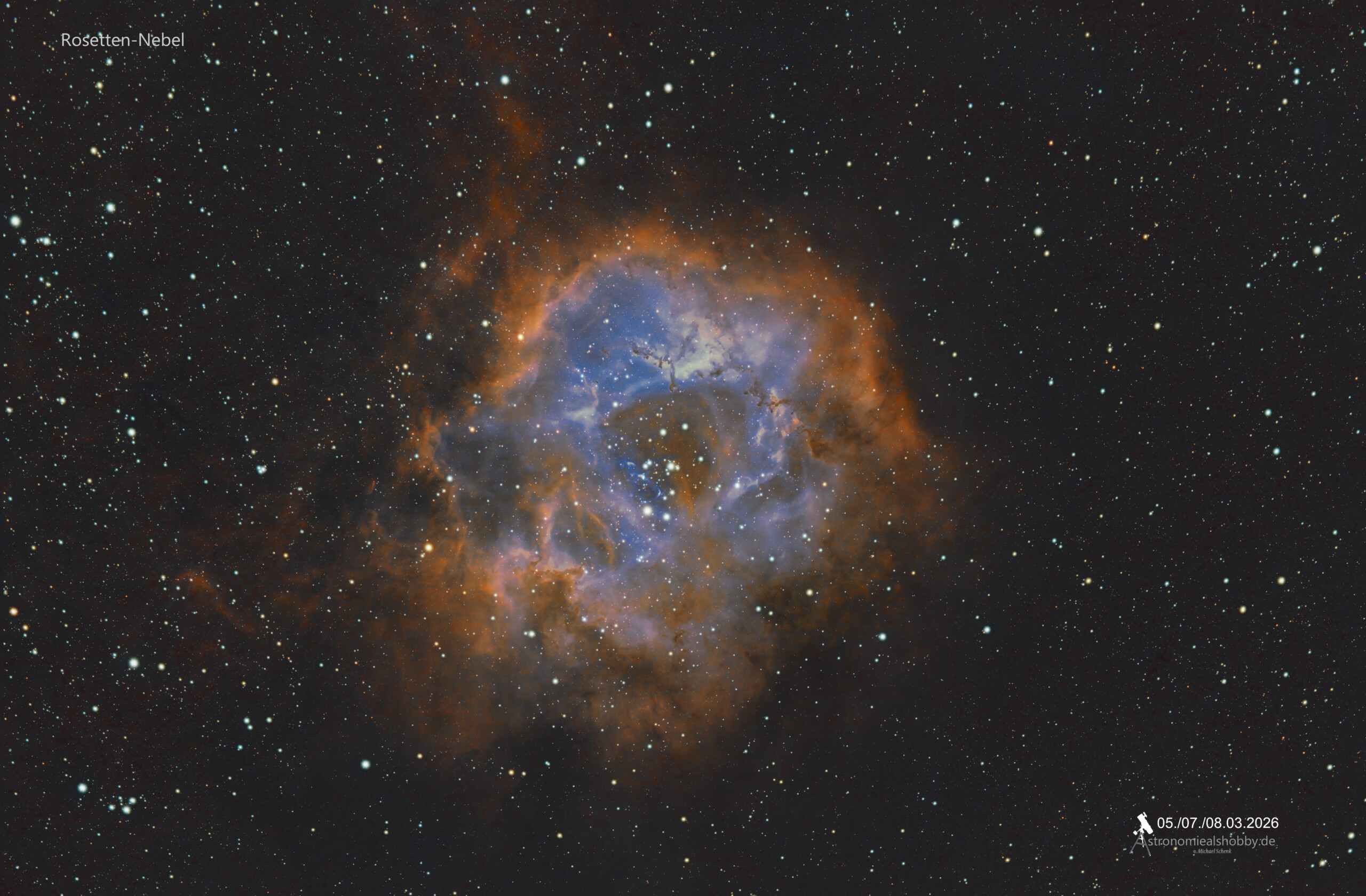 Sky-Watcher N 150/750 PDS; Sky-Watcher EQ6-R Pro; Omegon Guidescope 50/200 mm; Guidingcam: Omegon GUIDE 2000C; Kamera: Omegon veTEC571C; Filter: UV/IR und L-eXtreme 2″; automatischer FlatPanel; Autofocuser; mini PC mit Stellarium / N.I.N.A / SharpCap und PHD2,